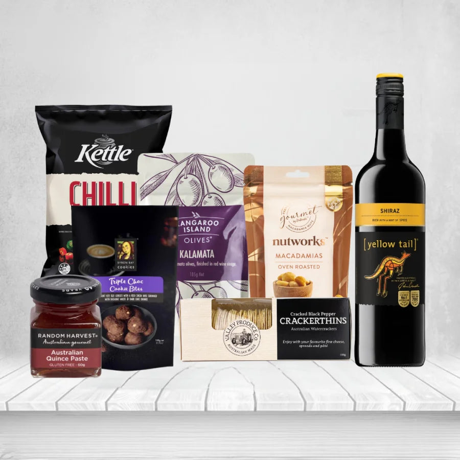 This luxury snack hamper is thoughtfully curated for anniversaries and special moments, making it a popular choice in both the snack hamper and anniversary gift categories. It features an indulgent mix of premium Australian treats and a celebrated bottle of wine to deliver a gourmet experience right to the recipient's door. Perfect for couples celebrating their love, this hamper combines sweet, savoury, and gourmet elements, ensuring a delightful sharing platter designed to impress.